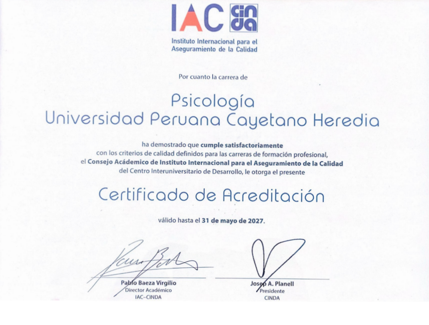 La carrera de psicología cuenta con acreditación internacional otorgada por IAC-CINDA para el periodo 2022-2027. Este reconocimiento valida nuestro compromiso sostenido con la calidad universitaria, la mejora continua y la responsabilidad institucional.