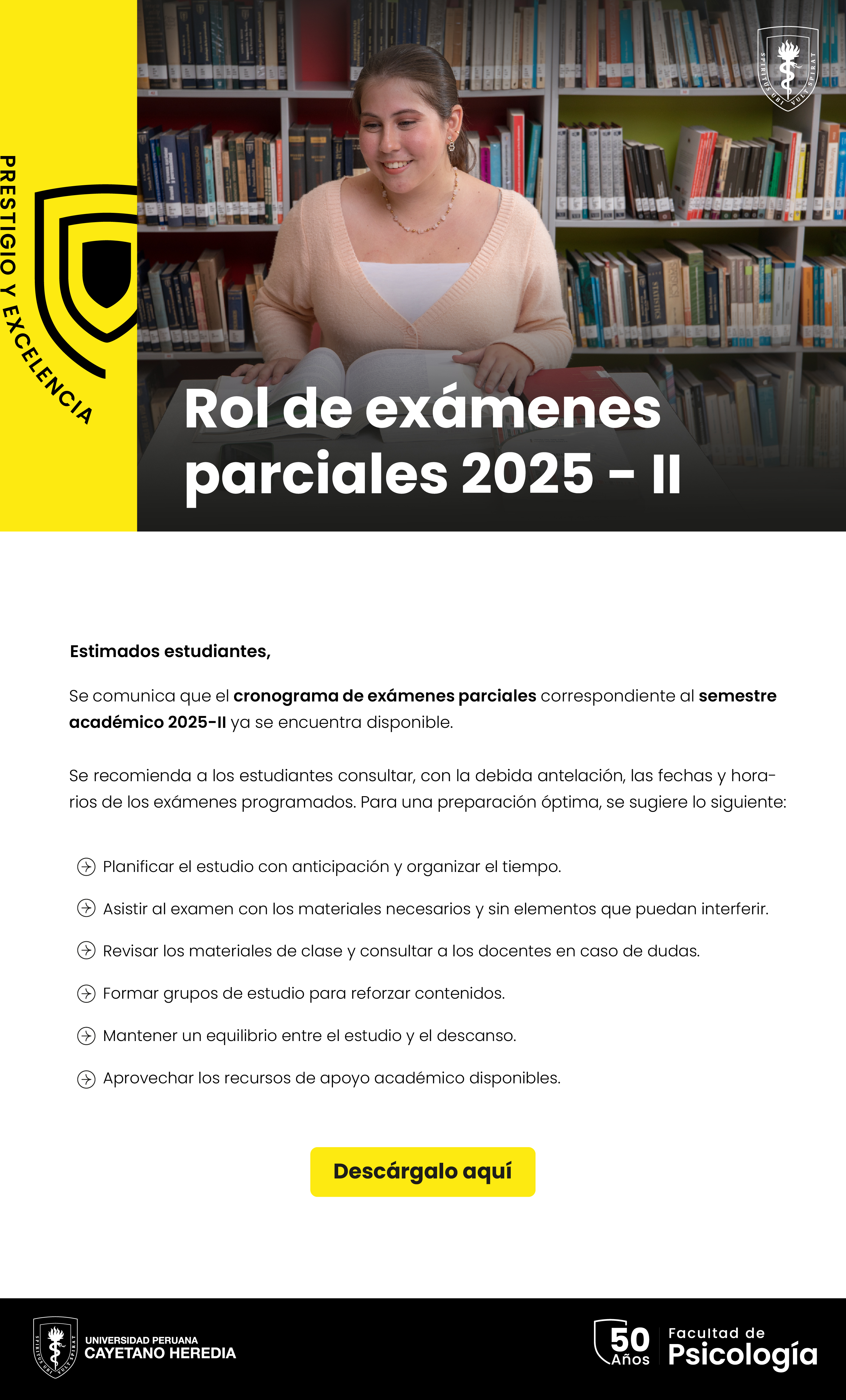 Nos complace informarles que ya se encuentra disponible el cronograma de exámenes parciales correspondiente al semestre académico 2025-II. Ingresa AQUÍ y descárgalo.
