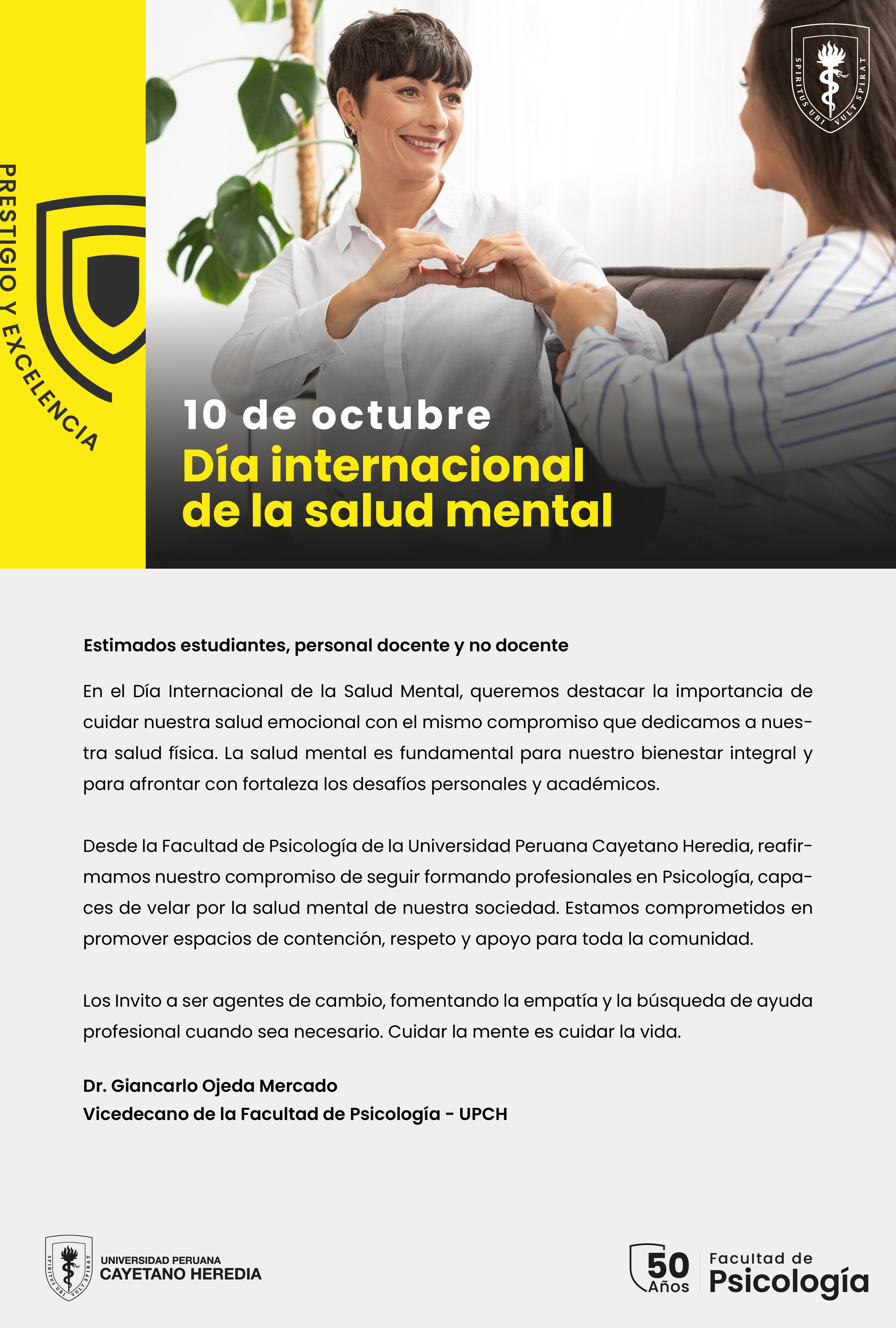 Compartimos además un mensaje especial de nuestro Vicedecano de la Facultad de Psicología, Dr. Giancarlo Ojeda Mercado, quien reitera el compromiso de la facultad por formar profesionales dedicados al cuidado de la salud mental y el bienestar de toda la sociedad.