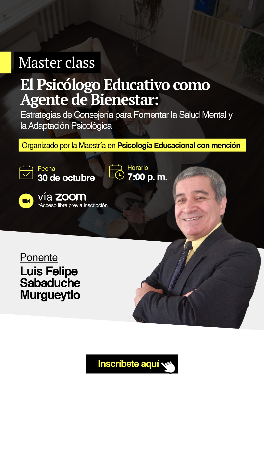 Fecha: 30 de octubre – Hora: 07:00 p.m. – Modalidad: Virtual (ZOOM) – Regístrate en el siguiente enlace: https://shorturl.at/fa82Y