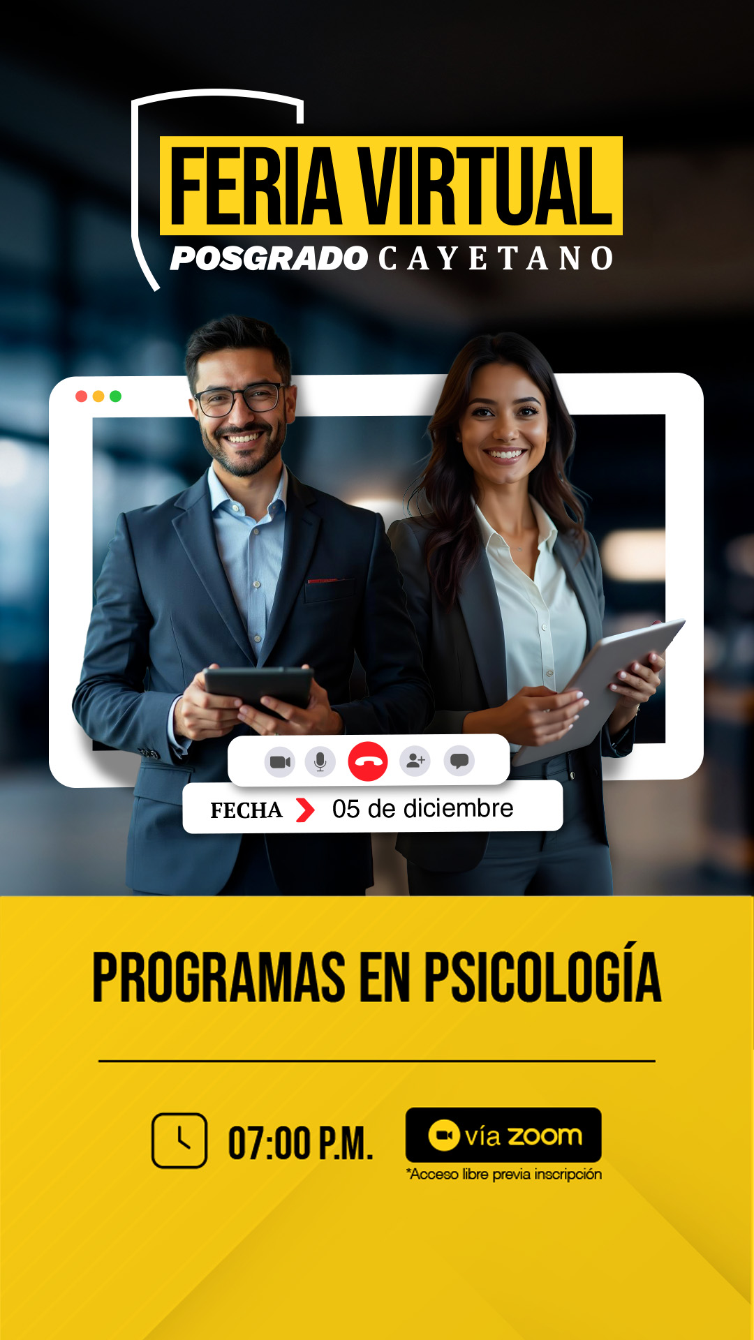 La Facultad de Psicología anuncia la realización de la Feria Virtual de los Programas de Maestrías y Doctorado en Psicología, a desarrollarse el miércoles 26 de noviembre a las 19:00 horas. La actividad tiene como finalidad brindar información detallada sobre la oferta académica de posgrado, sus enfoques formativos y las oportunidades de especialización que contribuyen al fortalecimiento del desarrollo profesional de los participantes.