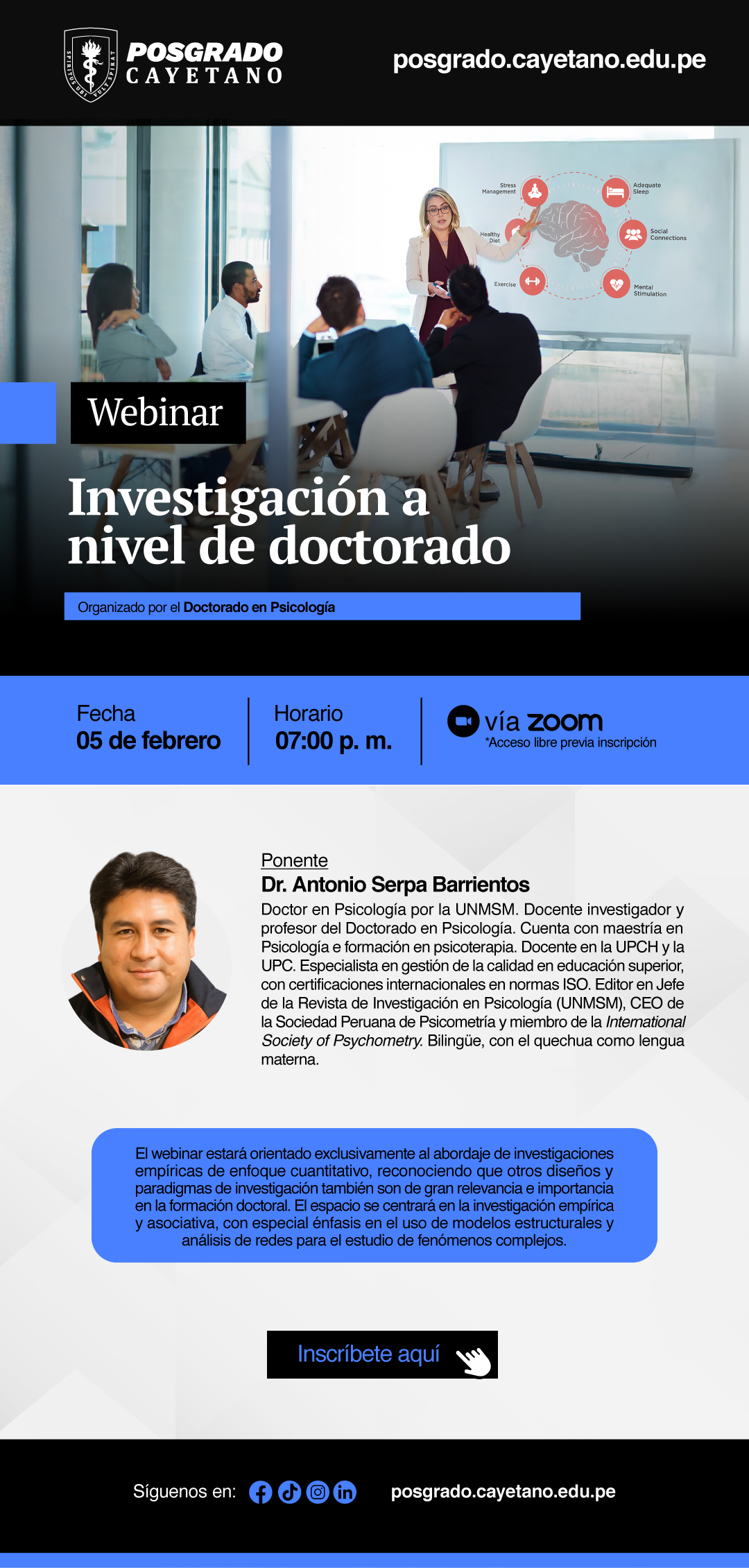 Participa del webinar: «Investigación a nivel de doctorado», que será dirigido por el Dr. Antonio Serpa, Doctor en Psicología. Esta actividad se llevará a cabo el día jueves 05 de febrero a las 07:00 p.m. a través del ZOOM. Ingreso libre. Regístrate en el siguiente enlace: https://bit.ly/4tiVf6I