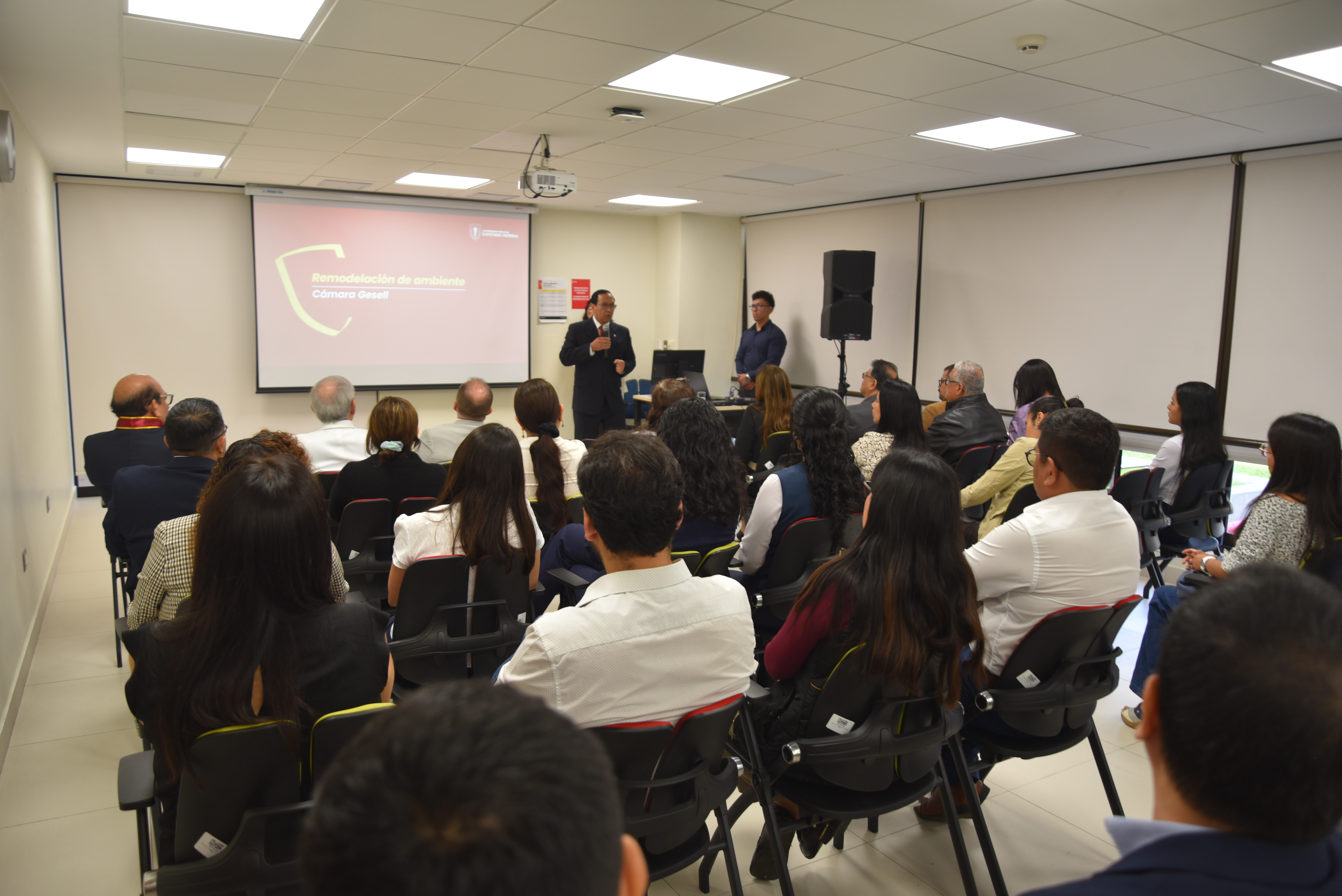 El acto protocolar se inició con las palabras del Dr. López Villavicencio, quien, visiblemente emocionado, destacó los beneficios académicos y formativos que continuará brindando la Cámara Gesell remodelada, subrayando su impacto en la calidad de la enseñanza y en la preparación profesional de los estudiantes.